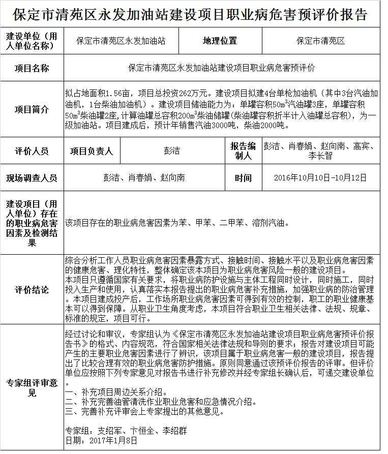 保定市清苑区永发加油站建设项目职业病危害预评价